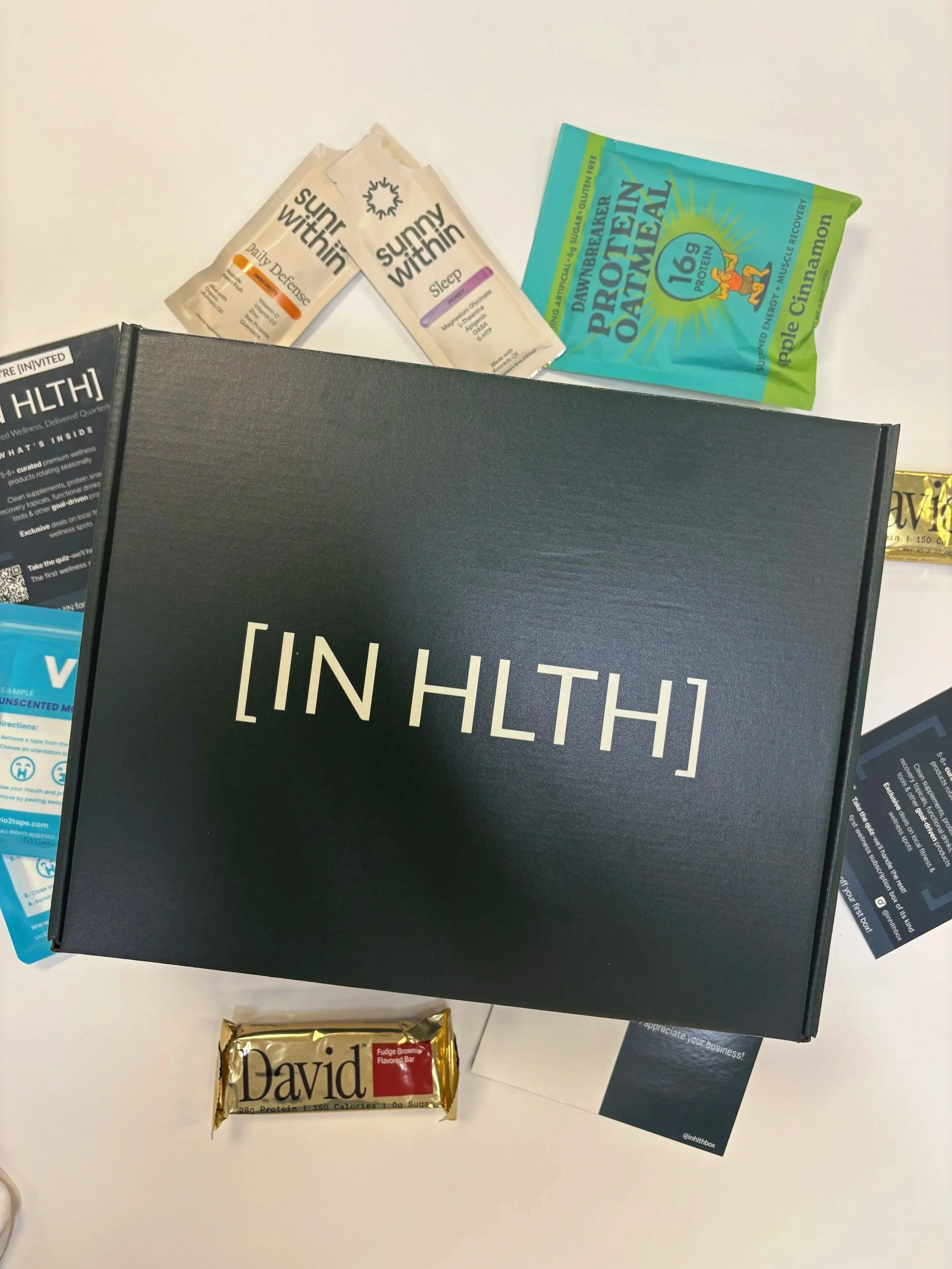 Personalized from your quiz, each [IN HLTH] box delivers 5–6+ full-size wellness finds, from recovery tools and functional snacks to hydration and lifestyle must-haves.